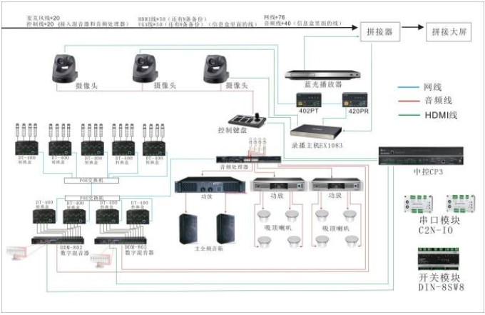 特別是在軍事機密之地,嚴肅、謹慎、高度戒備,在其會議室設備選擇上,除了要考慮到以上問題,還要求性能穩定,高效快捷,保密性強。經過多次篩選,軍區選用了DANTE智慧會議分布式解決方案:音頻部分用了CLOCKAUDIO的界面麥克風、名舞臺科技德捷品牌的DANTE網絡音頻轉換盒(DT-400 )、8路數字自動混音器、思美處理器、銳豐百靈達音箱,視頻部分用了哲聞科技柏邇品牌的網絡傳輸器(TP-402P HDBast),音視頻相結合,共同搭建了一個安全、高效、兼容傳統與DANTE、易于擴展的新型會議系統。