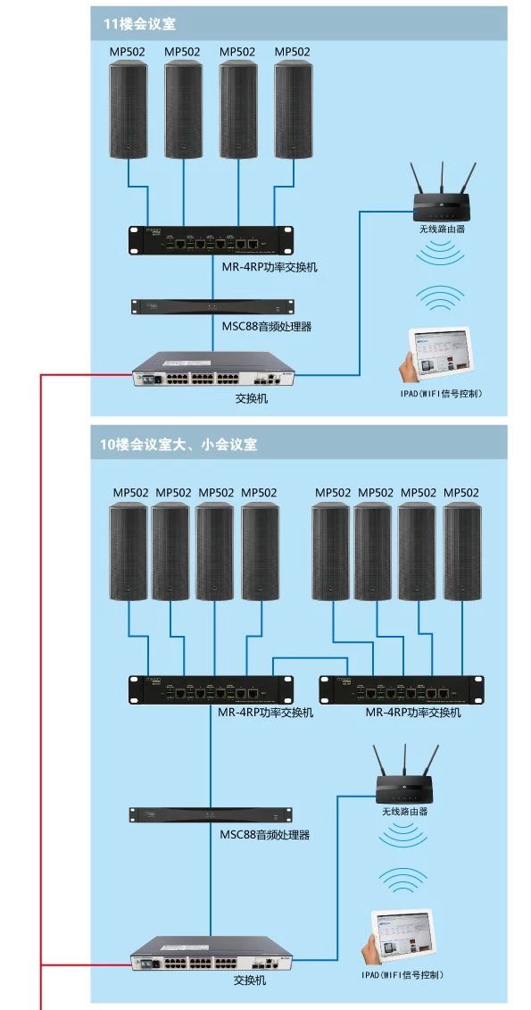 在此次項(xiàng)目設(shè)計(jì)中,工程商選用了Mission Pro MP全頻系列中的MP-502作為會(huì)議室和多功能廳的主擴(kuò)揚(yáng)聲器。MP-502為雙5.5寸有源壁掛音箱,內(nèi)置Dante與D類功放模塊,通過一根網(wǎng)線進(jìn)入系統(tǒng)MR-4RP功率交換機(jī);MR-4RP通過網(wǎng)線連接MSC-88音頻處理器,最終通過網(wǎng)線連接主交換機(jī),無需輸出模擬信號(hào),通過Dante網(wǎng)絡(luò)傳輸協(xié)議進(jìn)行數(shù)據(jù)處理。整座大廈采用了整合性極高的多功能分布式云控制系統(tǒng)。