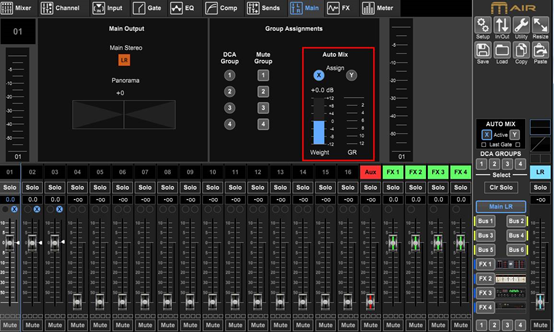 這里的AUTO MIX可分為兩組,分別為X和Y,還有一個AUTO Weight(自動優(yōu)先級的量)可進行調(diào)整,還有一個GR電平表可觀察到每個通道分享增益量的大小。