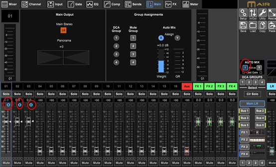 下面我給前三個通道編到X組,這里要注意的是,在給每個通道分完組之后,要記得把總的AUTO MIX的開關(guān)打開,如圖紅圈所示。