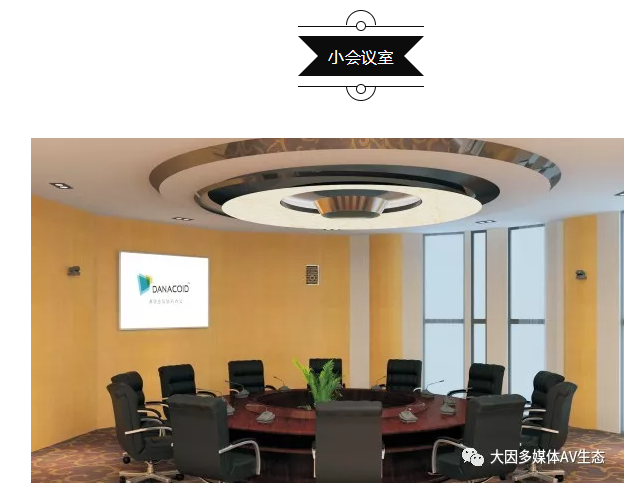 小會議室定位于圓桌討論會議室,主要應用于日常會議、圓桌討論等。因此需要滿足一般性的會議語言類的擴聲和視頻顯示的功能。同時如果作為分會場使用時需要滿足把主會場的音視頻信號實時的發送到小會議室來。
