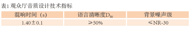 作為平潭國(guó)際演藝中心的核心建筑,1 500座劇場(chǎng)除了要滿(mǎn)足專(zhuān)業(yè)歌劇、舞劇的演出需求外,還要兼顧大型綜藝以及大型會(huì)議的使用要求。因此,觀(guān)眾廳音質(zhì)設(shè)計(jì)原則確定為“擴(kuò)聲演出為主”,所有演出形式均使用擴(kuò)聲系統(tǒng),而建聲設(shè)計(jì)只需要為擴(kuò)聲系統(tǒng)創(chuàng)造良好的建聲環(huán)境即可?;诖?,音質(zhì)設(shè)計(jì)時(shí)重點(diǎn)關(guān)注于體型合理、混響合適、廳內(nèi)無(wú)聲缺陷及本底噪音足夠低等目標(biāo)。與之對(duì)應(yīng),在音質(zhì)設(shè)計(jì)指標(biāo)的確定時(shí),以混響時(shí)間、語(yǔ)言清晰度D50及背景噪聲級(jí)作為主要的技術(shù)指標(biāo)。