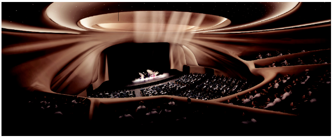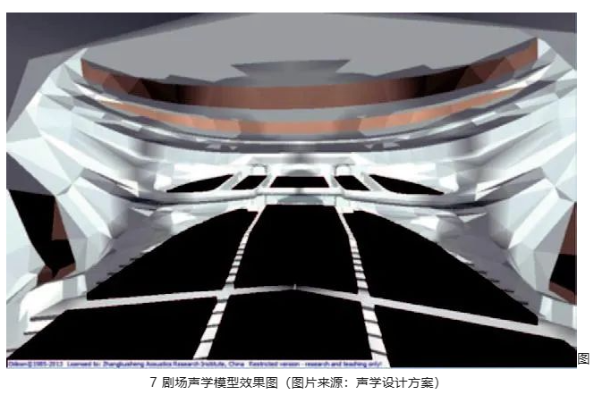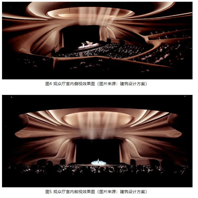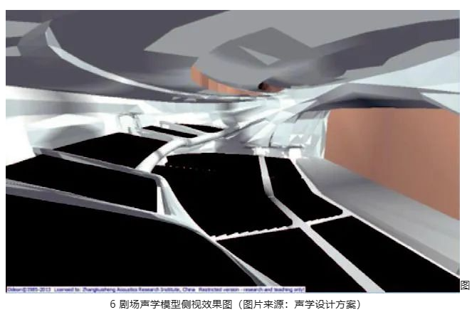 體型設(shè)計(jì)是建聲設(shè)計(jì)的基礎(chǔ),因?yàn)榉瓷渎暤姆较蚝湍芰糠植贾饕蕾?lài)于墻面及頂面的體型設(shè)計(jì)。但作為以擴(kuò)聲演出為主的廳堂,演出時(shí)聲音主要來(lái)源于揚(yáng)聲器系統(tǒng),因此,建聲設(shè)計(jì)在體型設(shè)計(jì)方面主要是在滿(mǎn)足室內(nèi)視覺(jué)效果的同時(shí)避免各種聲學(xué)缺陷的產(chǎn)生。圖4和圖5分別為建筑設(shè)計(jì)師提供的不同視角的原創(chuàng)室內(nèi)效果圖。