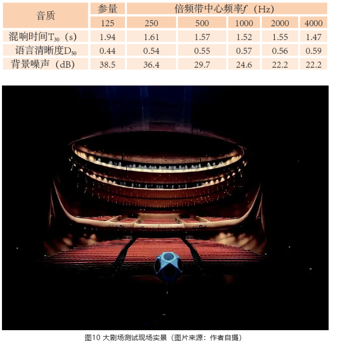2022年9月28日,筆者帶領(lǐng)團(tuán)隊(duì)依據(jù)相關(guān)技術(shù)標(biāo)準(zhǔn)[2,3]的要求對(duì)平潭國(guó)際演藝中心大劇場(chǎng)進(jìn)行了音質(zhì)參量的空?qǐng)鰷y(cè)試,結(jié)果如表3所示,圖10所示為測(cè)試現(xiàn)場(chǎng)實(shí)景。