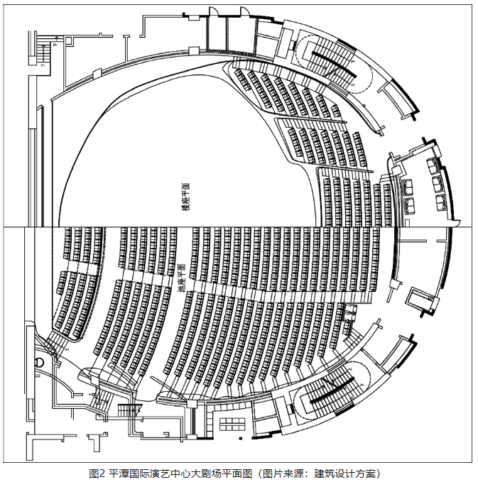 大劇場(chǎng)品字形舞臺(tái)的前端配置升降樂(lè)池,可臨時(shí)安裝118個(gè)活動(dòng)座椅。觀(guān)眾廳呈馬蹄形,座位數(shù)1 500座,總?cè)莘e約12 600 m3,每座容積約8.4 m3/人。觀(guān)眾廳后墻到舞臺(tái)邊緣距離為32.77 m,廳內(nèi)最寬為32.66 m,最高凈空 16.43 m,平均高度約13.45 m。池座有25排座椅,采用全臺(tái)階起坡設(shè)計(jì),首末排高差為6.0 m。樓座觀(guān)眾席同樣采用全臺(tái)階起坡設(shè)計(jì),中間區(qū)域的前后高差為2.58 m,平均起坡為0.43 m。音響控室與燈光控室位于池座后部的中間區(qū)域。觀(guān)眾廳兩側(cè)八字墻各設(shè)置兩道耳光,觀(guān)眾廳天花設(shè)置兩道面光,樓座后方中間區(qū)域設(shè)置追光室。圖2和圖3分別為一層和二層平面圖和剖面圖。