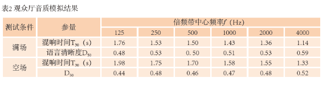 從表2可知,計(jì)算機(jī)模擬的各個(gè)聲學(xué)參量均在設(shè)計(jì)要求范圍內(nèi)。這說(shuō)明經(jīng)過(guò)多輪的調(diào)整優(yōu)化,最終確定的觀(guān)眾廳的體型以及材料均是合適的。