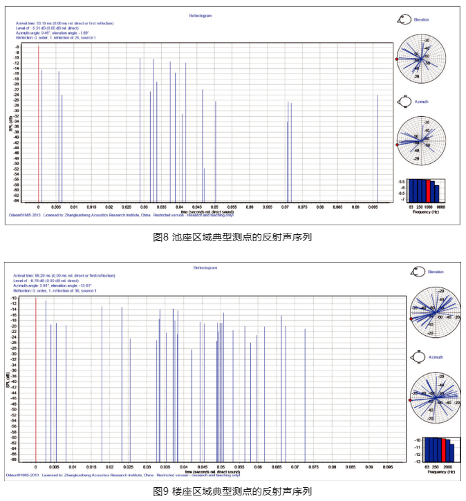 反射聲序列對(duì)音質(zhì)效果也是有一定影響的,圖8和圖9分別為池座和樓座典型測(cè)點(diǎn)的反射聲序列圖。從測(cè)點(diǎn)反射聲序列的模擬結(jié)果看,廳內(nèi)反射聲也比較合理,前50 ms內(nèi)也有一定數(shù)量的反射聲。