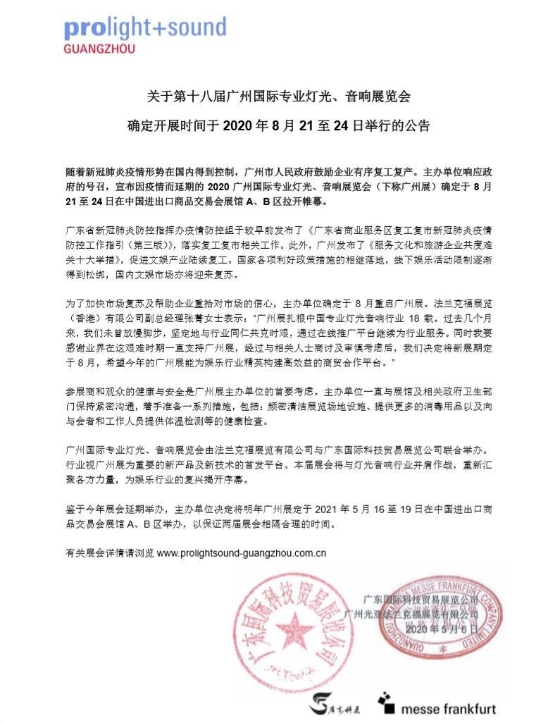 為了加快市場(chǎng)復(fù)蘇及幫助企業(yè)重拾對(duì)市場(chǎng)的信心,主辦單位確定于8月重啟廣州展。法蘭克福展覽(香港)有限公司副總經(jīng)理張菁女士表示:“廣州展扎根中國(guó)專(zhuān)業(yè)燈光音響行業(yè)18載,過(guò)去幾個(gè)月來(lái),我們未曾放慢腳步,堅(jiān)定地與行業(yè)同仁共克時(shí)艱,通過(guò)在線推廣平臺(tái)繼續(xù)為行業(yè)服務(wù)。同時(shí)我要感謝業(yè)界在這艱難時(shí)期一直支持廣州展,經(jīng)過(guò)與相關(guān)人士商討及審慎考慮后,我們決定將新展期定于8月,希望今年的廣州展能為娛樂(lè)行業(yè)精英構(gòu)建高效益的商貿(mào)合作平臺(tái)。”