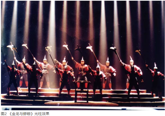 例如,在征戰(zhàn)這場戲中,選用16臺(tái)par燈,放在舞臺(tái)后區(qū),根據(jù)打擊樂的節(jié)奏,借助煙霧,與演員動(dòng)作緊密結(jié)合之后,在空間形成16道光柱,以寫意和抽象的方式表達(dá)征戰(zhàn)的勝利(圖2)。現(xiàn)在看來,16臺(tái)par燈,太少了。但在那個(gè)年代,整場演出用燈超過60臺(tái),就算是大制作。如果16臺(tái)par燈僅用一次,作為特殊效果燈而存在,那不是太少,而是太多了。一方面,由于當(dāng)時(shí)條件受限,每一臺(tái)燈都需要爬大約8 m高梯子對光,非常危險(xiǎn);另一方面,燈光設(shè)計(jì)具有繪畫能力、造型能力,每一組燈都是在特定場景中布置的特殊效果燈,都是為了某個(gè)特定場景而存在,所以每一臺(tái)燈或每一組燈,都有非常明確的使用目的。筆者這代人在燈光設(shè)計(jì)過程中,受到的是特殊效果燈的訓(xùn)練。如果要使特殊效果燈起作用,必須精讀文本,且要在排練場看彩排,深入了解導(dǎo)演所有的場面調(diào)度和處理。只有這樣,燈光設(shè)計(jì)才能做到心中有數(shù),才敢用一個(gè)燈投射下去,并把規(guī)定情境的思想情感與形式美感表達(dá)出來。
