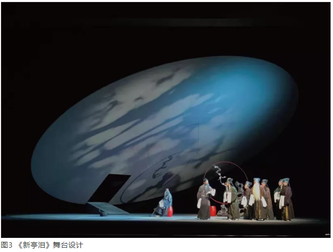 《新亭淚》舞臺(tái)設(shè)計(jì)中,設(shè)計(jì)了一個(gè)直徑16 m的大圓盤,通過數(shù)控技術(shù)可以實(shí)現(xiàn)上下運(yùn)動(dòng)與翻飛等動(dòng)作,中間又開有幾個(gè)功能性的數(shù)控方洞,提供不同場景的切換,創(chuàng)造不同的空間環(huán)境(圖3)。這個(gè)大圓盤把舞臺(tái)空間所有的燈位擋住了,以至于舞臺(tái)中橫向吊桿系統(tǒng)所提供的掛燈方式均不能使用,這就意味著燈光設(shè)計(jì)最基本的方法和手段都不能運(yùn)用。如果舞臺(tái)設(shè)計(jì)與燈光設(shè)計(jì)是兩個(gè)人,一定會(huì)產(chǎn)生矛盾。舞臺(tái)設(shè)計(jì)如果不懂燈光,可能會(huì)顧忌劇場固定的燈位,不會(huì)這樣設(shè)計(jì)大圓盤。而作為燈光設(shè)計(jì),筆者有意不使用傳統(tǒng)燈位,這樣燈光才有可能產(chǎn)生特殊的效果。如果經(jīng)常使用熟悉的燈位,就會(huì)產(chǎn)生熟悉的舞臺(tái)效果。在戲劇舞臺(tái)中,人們常常發(fā)現(xiàn)許多演出燈光效果千篇一律、大同小異。這是因?yàn)殓R框式舞臺(tái)所提供的燈位,使燈光設(shè)計(jì)必須按照固定燈位進(jìn)行布光。當(dāng)然,更為重要的一點(diǎn)是,燈光設(shè)計(jì)的審美水平不夠,不能用審美的方式區(qū)別普遍性與特殊性的關(guān)系,也就只能用有限的、熟悉的方法和手段制作熟悉的舞臺(tái)燈光效果。該劇中,由于筆者既是舞臺(tái)設(shè)計(jì),又是燈光設(shè)計(jì),知道把傳統(tǒng)燈位遮住后,必須尋找特殊燈位進(jìn)行燈光創(chuàng)造。該劇采用的燈具數(shù)量其實(shí)非常少,而且都是特殊效果燈,臺(tái)口柱光和幾臺(tái)側(cè)面的流動(dòng)燈,就把戲劇需要的所有舞臺(tái)燈光的千變?nèi)f化都表現(xiàn)出來。