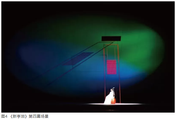 另外,中國的舞臺(tái)燈光現(xiàn)在已經(jīng)有其應(yīng)有的美學(xué)品格。在該劇中,筆者采用中國傳統(tǒng)青山綠水的設(shè)色方式,營造空間氣氛,借以傳達(dá)中國藝術(shù)氣質(zhì)和精神。如第四幕閨房中,上場門流動(dòng)的藍(lán)色光與下場門頂側(cè)的綠色光,在大圓盤不同區(qū)位的染色過程中,根據(jù)光源的明亮變化程度和色彩的衰減漸變,營造美輪美奐的光色影變化(圖4)。