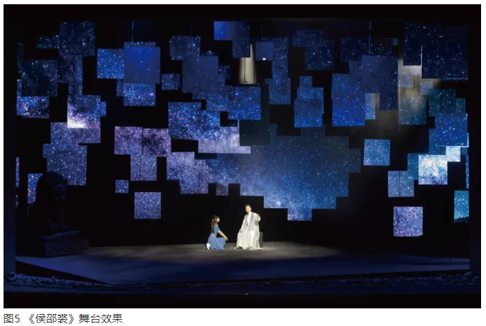 在劇本解讀后,主創(chuàng)團(tuán)隊(duì)提煉了16個(gè)字“瘡痍大地”“迷霧漫漫”“流星飛逝”“光耀千秋”,作為形象創(chuàng)作的出發(fā)點(diǎn)。為了創(chuàng)造“瘡痍大地”“迷霧漫漫”“流星飛逝”的效果,舞美做了大膽嘗試。地面上是一塊傾斜的腐蝕的鋼板,周圍有一些碎石。傾斜的臺(tái)面、腐蝕的鋼板,暗喻滿目瘡痍、風(fēng)雨飄搖的中華大地。在舞臺(tái)空間采用13道吊桿,每道吊桿都參差懸掛大小不等的一塊塊LED屏,在空間吊掛不同層次的LED小屏,帶有裝置藝術(shù)的意味和觀念,充滿一種意象和現(xiàn)代感(圖5)。由于這些LED屏幕組塊在空中吊掛的高度、縱深不同,以至于所有的完整形象投射到這個(gè)屏幕之后,都會(huì)產(chǎn)生支離破碎的不完整之感,以此來表達(dá)主創(chuàng)團(tuán)隊(duì)對劇本形象的開掘。讓人物性格精神的成長生活在特定的空間環(huán)境中,是戲劇震撼人心的必要前提。所以,沒有設(shè)計(jì)描繪性的動(dòng)作環(huán)境空間,而是提煉出一個(gè)隱喻和象征性的空間,運(yùn)用局部的破碎形象暗示劇情的環(huán)境。