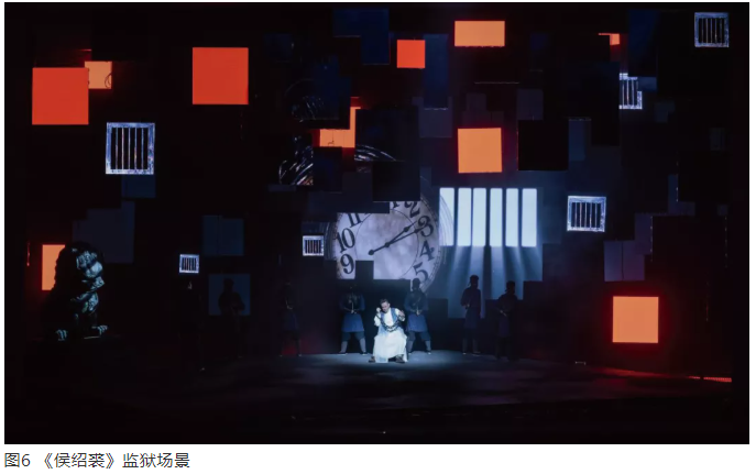比如,劇中監(jiān)獄窗格透出的光束形象是屏幕形象,而不是燈光光影形象(圖6)。它是一種光景,借助多媒體手段創(chuàng)造的環(huán)境形象。在這個(gè)屏幕形象呈現(xiàn)過程中,舞臺(tái)燈光也創(chuàng)造與其相一致的光影效果,通過視覺錯(cuò)視,使平面和立體效果產(chǎn)生關(guān)系,進(jìn)而形成渾然一體的戲劇動(dòng)作空間。多媒體的形象和燈光的形象是一體的,而且多媒體形象作為一個(gè)完整的形象,視覺效果特別奪目,在信息傳遞上又特別有效。對于當(dāng)代的燈光設(shè)計(jì),多熟悉多媒體技術(shù)和手段,是很有價(jià)值的。現(xiàn)代戲劇有一個(gè)顯著的特征,不是手段匱乏,而是手段太多。在戲劇空間中,如何節(jié)制地運(yùn)用技術(shù)手段,是當(dāng)代舞臺(tái)空間演出中一個(gè)特別值得思考的話題。