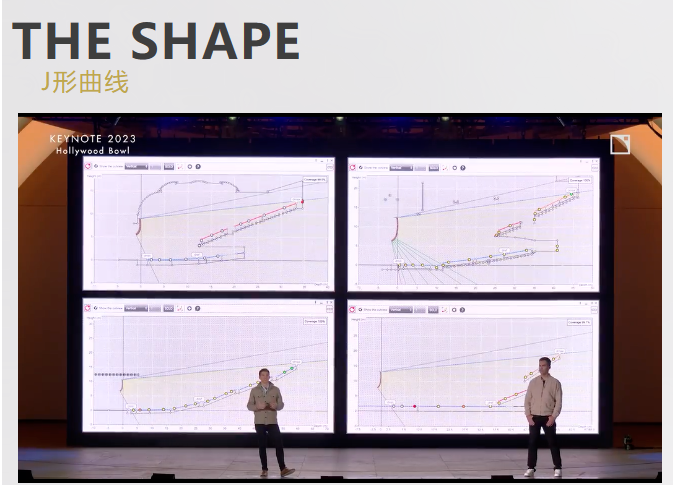 所有的這些形狀都有一個非常相似的趨勢——就是觀眾的距離越遠,音箱的吊掛高度越高。當我們安裝一個線陣列時,從數據上來看陣列都是呈相同的J型曲線,頂部的陣列通常是小角度,越向底部角度逐漸增大,而這樣的漸進式構造已經應用了三十多年時間。