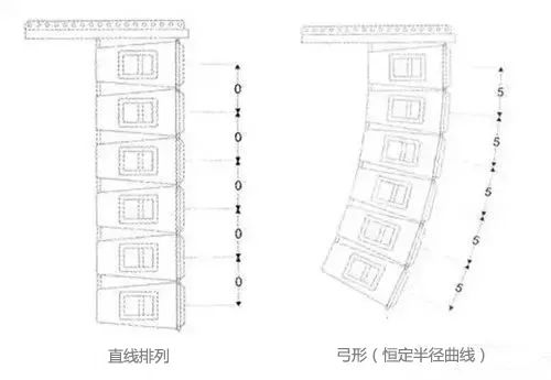 線陣列揚(yáng)聲器系統(tǒng)是由一列單元箱組成,這些單元箱按一定規(guī)則排列,根據(jù)聲場(chǎng)需要可以排成直線、弓形(恒定半徑曲線)、“J”字形和漸開(kāi)線等。