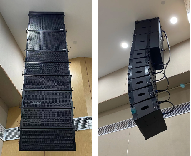 人社局多功能廳音頻擴聲系統(tǒng),采用美國PHONIC揚聲器,考慮現場實際情況和業(yè)主的功能需求,左右主擴各采用6只KT-8八寸三分頻兩驅動線陣列揚聲器,和左右各2只配套吊掛超低KT8SUB,覆蓋全場觀眾席。