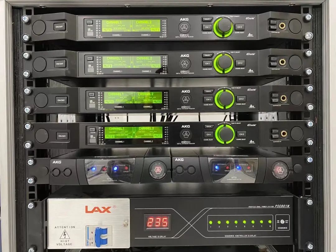 拾音系統(tǒng)上,則由國際著名品牌AKG打造,采用參考級DMS800系列數字無線系統(tǒng)共8個通道,包括4臺DSR800雙通道主機,4支DHT800/D7手持,4個DPT800腰包搭配4個LC82MD領夾麥克風和4個EC82MD耳掛式麥克風,無線話筒腰包領夾一應俱全,系統(tǒng)還使用了APS4天線分配器,外接2個SRA2 B/EW有源指向性UHF天線。